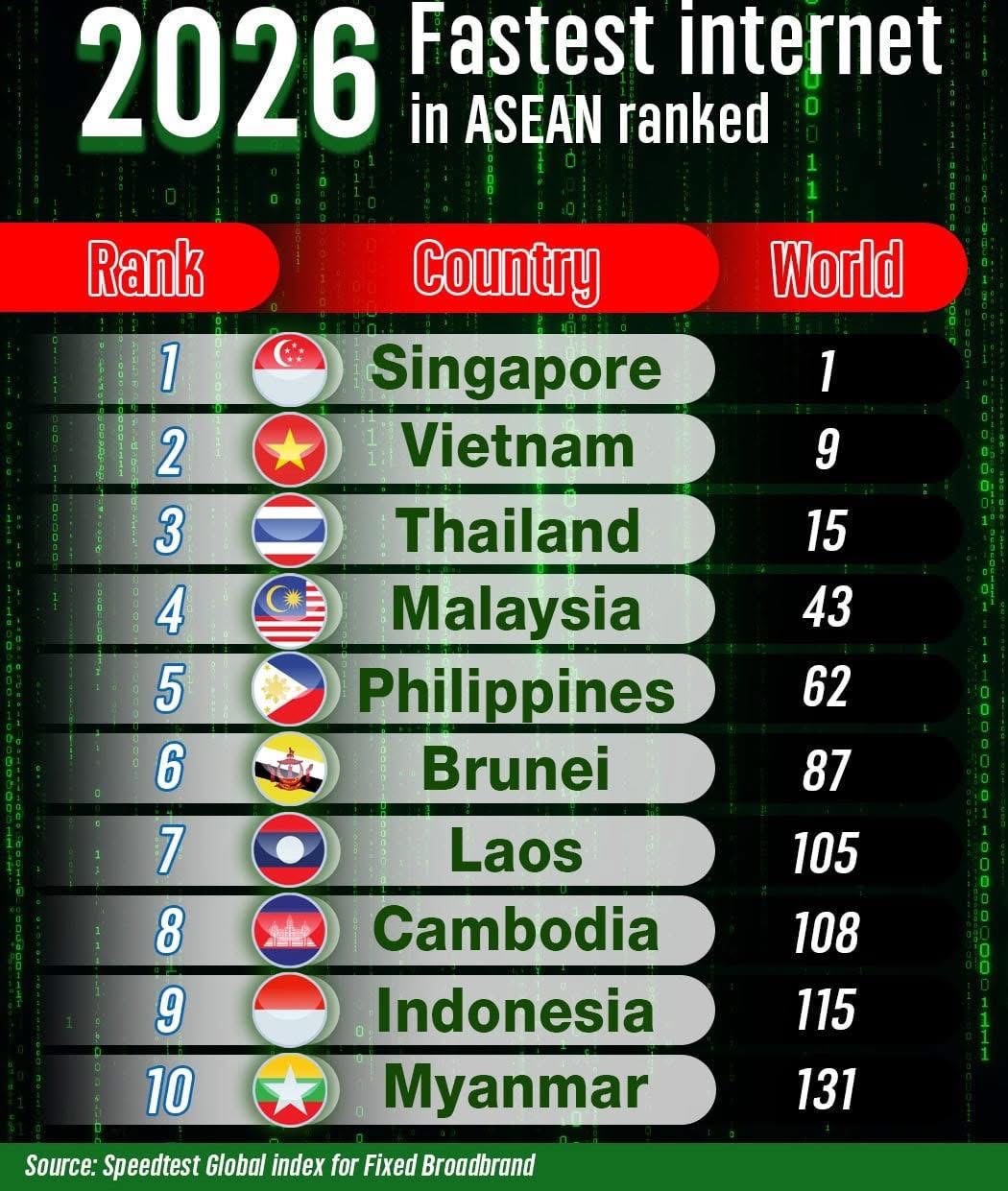 Speedtest.net ၏ ၂၀၂၆ ခုနှစ်၊ ဖေဖော်ဝါရီလအတွက် ကမ္ဘာလုံးဆိုင်ရာ အင်တာနက်အမြန်နှုန်း အညွှန်းကိန်း (Speedtest Global Index) အရ အာဆီယံဒေသတွင်း၌ စင်ကာပူနိုင်ငံက ကမ္ဘာ့အဆင့် (၁) ဖြင့် ထိပ်ဆုံးမှ ဦးဆောင်နေပြီး မြန်မာနိုင်ငံမှာမူ ကမ္ဘာ့အဆင့် (၁၃၁) ဖြင့် အာဆီယံတွင် အဆင့် (၁၀) ချိတ်ကာ အောက်ဆုံး၌ ရှိနေကြောင်း သိရသည်။ အဆိုပါ အဆင့်သတ်မှတ်ချက်မှာ နေအိမ်နှင့် ရုံးခန်းသုံး ကြိုးတပ်ဆင်ရသည့် (Fixed Broadband) အမြန်နှုန်းကိုသာ အခြေခံထားခြင်းဖြစ်ပြီး၊ ဗီယက်နမ်က အာဆီယံအဆင့် (၂) (ကမ္ဘာ့အဆင့် ၉) နှင့် ထိုင်းနိုင်ငံက အာဆီယံအဆင့် (၃) (ကမ္ဘာ့အဆင့် ၁၅) တို့တွင် အသီးသီး ရပ်တည်နေကြောင်း သိရှိရပါသည်။