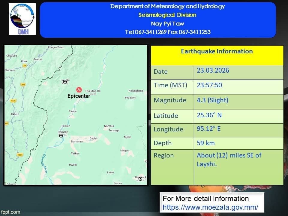 စစ်ကိုင်းတိုင်း၊ နာဂကိုယ်ပိုင်အုပ်ချုပ်ခွင့်ရဒေသ၊ လေရှီးမြို့ကိုဗဟိုပြု၍ မတ် ၂၃ ရက်ညပိုင်းက အင်အားအနည်းငယ်ရှိသောငလျင်တစ်ခုလှုပ်ခတ်ခဲ့ကြောင်း မိုးလေဝသနှင့် ဇလဗေဒညွှန်ကြားမှုဦးစီးဌာနထံမှ သိရသည်။လေရှီးမြို့၏ အရှေ့တောင်ဘက်(၁၂)မိုင်ခန့်အကွာ၊ အ နက်(၅၉)ကီလိုမီတာကိုဗဟိုပြု၍ အင်အားရစ်(ခ်)တာစကေး(၄ ဒသမ ၃)အဆင့်ရှိ အင်အားအနည်းငယ်ရှိသောငလျင်သည် ည ၁၁ နာရီ ၅၇ မိနစ် ၅၀ စက္ကန့်ကလှုပ်ခတ်ခဲ့ကြောင်း သိရသည်။ထို့ပြင် ည ၆ နာရီ ၁၄ မိနစ် ၁၁ စက္ကန့်ကလည်း ပျဉ်းမနားမြို့၏ အနောက်တောင်ဘက်(၅)မိုင်ခန့်အကွာ၊ အ နက်(၁၂)ကီလိုမီတာကိုဗဟိုပြု၍ အင်အားရစ်(ခ်)တာစကေး(၄ ဒသမ ၄)အဆင့်ရှိ အင်အားအနည်းငယ်ရှိသောငလျင်လှုပ်ခတ်ခဲ့ကြောင်း သိရသည်။