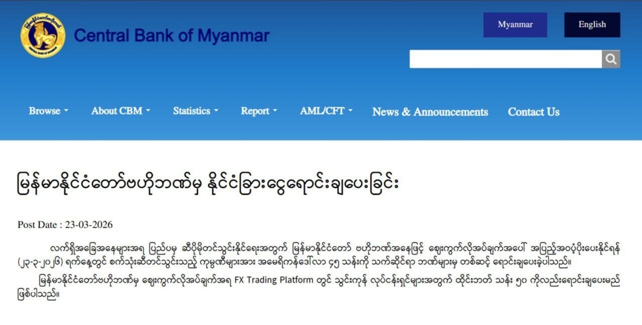 ဗဟိုဘဏ်မှ ဈေးကွက်လိုအပ်ချက်အရ FX Trading Platform တွင် သွင်းကုန်လုပ်ငန်းရှင်များအတွက် ထိုင်းဘတ်သန်း(၅၀)ရောင်းချပေးမည်ဟု အသိပေးခဲ့သည်။ယမန်နေ့ မတ် ၂၃ ရက်ကလည်း စက်သုံးဆီတင်သွင်းသည့် ကုမ္ပဏီများအား အမေရိကန်ဒေါ်လာ(၄၅)သန်းကို သက်ဆိုင်ရာဘဏ်များမှတစ်ဆင့် ရောင်းချပေးခဲ့သည်ဟု အသိပေးခဲ့သည်။အဆိုပါ အမေရိကန်ဒေါ်လာ(၄၅)သန်းအား ဗဟိုဘဏ်မှ ဈေးကွက်လိုအပ်ချက်အပေါ်အပြည့်အဝပံ့ပိုးပေးနိုင်ရန် လက်ရှိအခြေအနေများအရ ပြည်ပမှဆီပိုမိုတင်သွင်းနိုင်ရေးအတွက်ရောင်းချပေးခဲ့ခြင်းဖြစ်သည်ဟု အသိပေးခဲ့သည်။