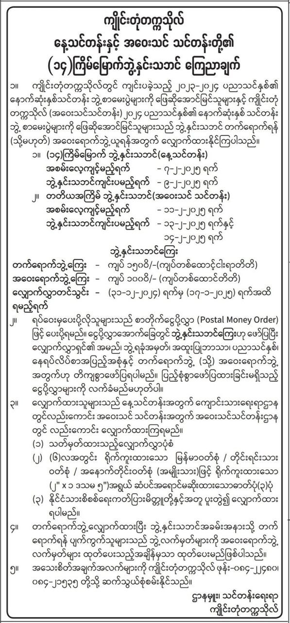 ရှမ်းပြည်နယ် ကျိုင်းတုံတက္ကသိုလ် နေ့သင်တန်းနှင့် အဝေးသင်သင်တန်းတို့၏ (၁၄)ကြိမ်မြောက် ဘွဲ့နှင်းသဘင်အခမ်းအနားကို အထက်ပါအတိုင်း ကျင်းပမည်ဖြစ်ကြောင်း ထုတ်ပြန်ကြေညာထားသည်။