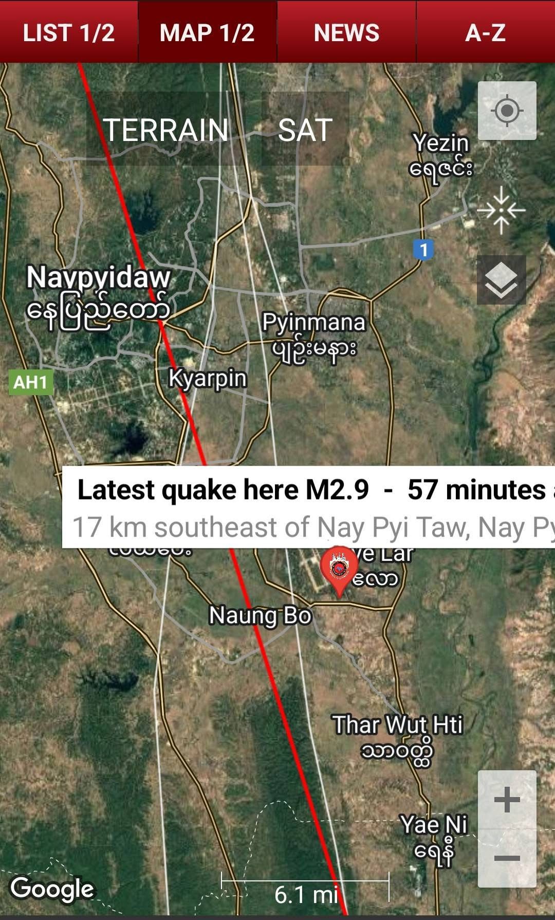 29/12/2024ရက်နေ့ယနေ့ညမြန်မာစံတော်ချိန် ၆:၄၁ နာရီအချိန်က မြန်မာနိုင်ငံပြည်တွင်း၊ နေပြည်တော်အရှေ့မြောက်၊ လယ်ဝေးအရှေ့ဘက်ပိုင်း ဧလာ အနီးက Nay Pyi Taw International Airport မြေအောက်အနက် ၆ မိုင်မှ မဂ္ဂနီကျု့ ၂.၉ အဆင့်မြေငလျင်ငယ် လှုပ်ရှားသွားခဲ့ကြောင်း သိရပါသည်။