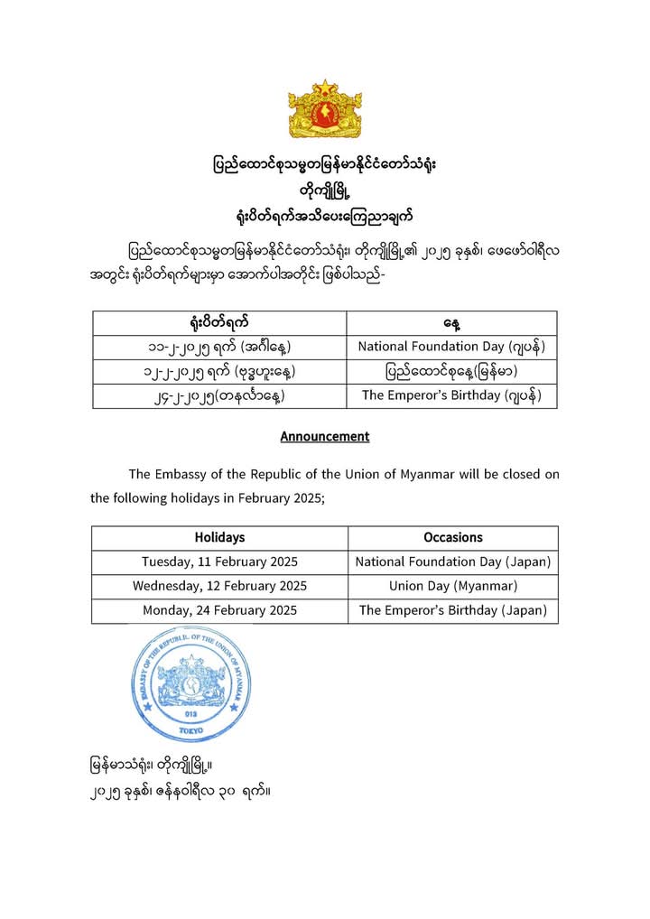 ဂျပန်နိုင်ငံဆိုင်ရာ မြန်မာသံရုံး၊ တိုကျိုမြို့မှ ၂၀၂၅ခုနှစ်၊ ဖေဖော်ဝါရီလအတွင်း ရုံးပိတ်ရက်များမှာ အောက်ပါအတိုင်းဖြစ်ကြောင်း ထုတ်ပြန်ကြေညာထားသည်။