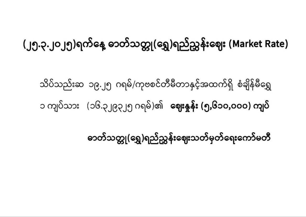 25.3.2025ရက်နေ့ရဲ့ ပြည်တွင်းဓာတ်သတ္တု(ရွှေ )ရည်ညွှန်းစျေး(Market Rate) မှာအောက်ပါအတိုင်းဖြစ်ပါသည်။