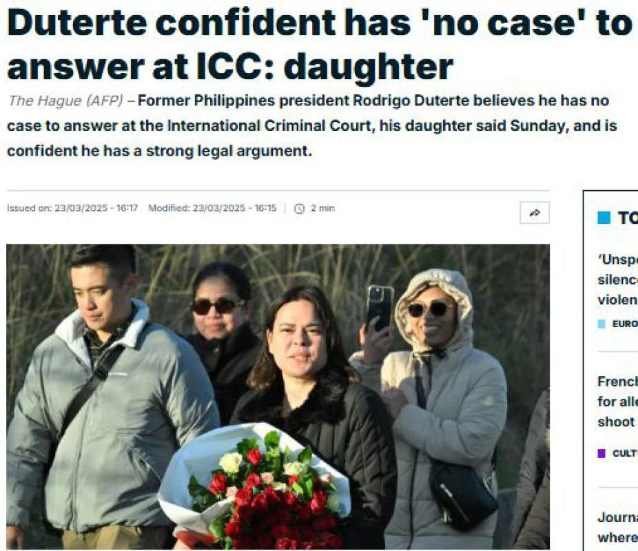 ဖိလစ်ပိုင်သမ္မတဟောင်း ဒူတာတေးဟာ နိုင်ငံတကာရာဇဝတ်တရားရုံးမှာ အမှုတွေကို ဖြေဆိုရမယ်အမှု ကိစ္စမရှိဘူးလို့ ၎င်းရဲ့သမီးဖြစ်သူ ဖိလစ်ပိုင်ဒုတိယသမ္မတ ဆာရာဒူတာတေး ကထုတ်ဖော်ပြောဆိုလိုက်ပါတယ်။ ဒူတာတေးဟာ လက်ရှိအချိန်မှာ သမ္မတအဖြစ်တာဝန်ယူချိန်အတွင်း မူးယစ်ဆေးဝါးစစ်ပွဲလုပ်ဆောင်ခဲ့ရာ လူပေါင်း ထောင်ချီသေဆုံးခဲ့တယ်လို့ စွပ်စွဲပြောဆိုခံရပြီး နိုင်ငံတကာရာဇဝတ်တရားရုံး ICC မှာ စွဲချက်တင်ခံရကာ ပြီးခဲ့တဲ့ ရက်ပိုင်းမှာ အမှုကို ပထမဆုံးကြားနာခဲ့တယ်လို့ သိရပါတယ်။
