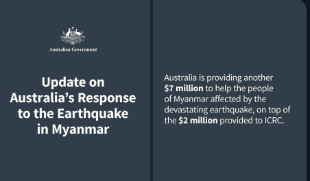 မြန်မာနိုင်ငံက ငလျင်ဘေးဒဏ်ခံခဲ့ရတဲ့ ပြည်သူတွေအတွက် ဩစတြေးလျနိုင်ငံက လူသားချင်းစာနာ ထောက်ထားမှုဆိုင်ရာ အကူအညီ ဒေါ်လာ ၇ သန်း ထပ်မံပေးအပ်သွားမယ်လို့ နိုင်ငံခြားရေးဝန်ကြီးဌာနက ဧပြီ ၂ ရက် ဒီနေ့ ထုတ်ပြန်ပါတယ်။ ဒီအကူအညီတွေထဲမှာ အစားအစာ၊ ရေနဲ့ သန့်ရှင်းရေး၊ အရေးပေါ်ကျန်းမာရေး နဲ့ ပညာရေး တို့အတွက် သြစတြေးလျ NGO တွေနဲ့ ဒေသတွင်း မိတ်ဖက်အဖွဲ့အစည်းတွေကတဆင့် ဒေါ်လာ ၃ သန်းခွဲ၊ မိတ်ဖက် အဖွဲ့အစည်းတွေရဲ့ အရေးပေါ် တောင်းခံမှုအတွက် ဒေါ်လာ ၅ သိန်းနဲ့ အာဆီယံ လူသားချင်းစာနာမှုဆိုင်ရာအကူအညီပေးအပ်ရေး ညှိနှိင်းမှုဗဟိုဌာန (AHA CENTRE) က တဆင့် အရေးပေါ်ကယ်ဆယ်ရေးပစ္စည်းတွေအတွက် ဒေါ်လာ ၃ သန်း ပါဝင်ပါတယ်။