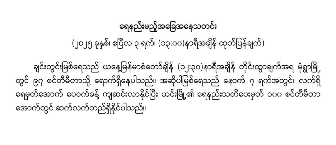 မိုးလေဝသနှင့်ဇလဗေဒညွှန်ကြားမှုဦးစီးဌာနမှ ၃-၄-၂၀၂၅ ရက်နေ့ နေ့လယ်(၁၄:၀၀)နာရီအချိန်တွင် ထုတ်ပြန်သည့်ရေနည်းမည့်အခြေအနေသတင်းကိုမိုးဇလမှအောက်ပါအတိုင်း ထုတ်ပြန်လိုက်ပါတယ်။