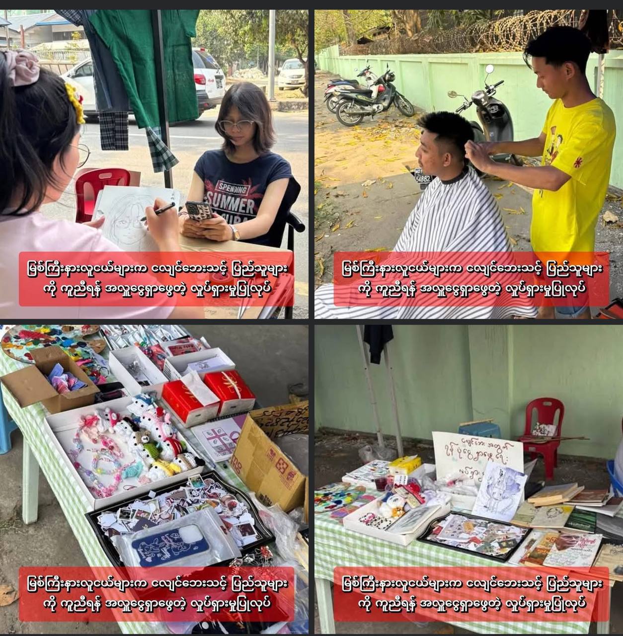 ကချင်ပြည်နယ် မြစ်ကြီးနားမြို့မှာ ငလျင်ဘေးသင့်ပြည်သူများအတွက် ရည်ရွယ်ပြီး မတ်လ ၃၀ ရက်နေ့ကနေ လူငယ်တွေ အလှူငွေရှာဖွေရေး လှုပ်ရှားမှုကမ်ပိန်း ပြုလုပ်ခဲ့ကြောင်း သိရပါတယ်။လှုပ်ရှားမှုမှာ ဆံပင်ညှပ်ခြင်း၊ ပုံတူဆွဲခြင်း၊ အစားအစာမုန့်၊ T-shirt၊ စာအုပ်နဲ့ အခြားလက်မှုပစ္စည်းများ ရောင်းပြီး အလှူငွေရှာဖွေခြင်းဖြစ်ကြောင်း ပြောပါတယ်။လှုပ်ရှားမှုကို မြစ်ကြီးနားမြို့ အထက (၂) ကျောင်းအနီးမှာ ပြုလုပ်နေတာဖြစ်ပြီး မွန်းလွဲ ၂ နာရီကနေ ညနေ ၅ နာရီခွဲအထိ လာရောက် ပါဝင်လှူဒါန်းနိုင်ပြီး၊ ရရှိတဲ့အလှူငွေများ အားလုံးကို ငလျင်ဘေးသင့်ပြည်သူတွေအတွက် လှူဒါန်းသွားမှာဖြစ်တယ်လို လှုပ်ရှားသူများထံမှ သိရပါတယ်။