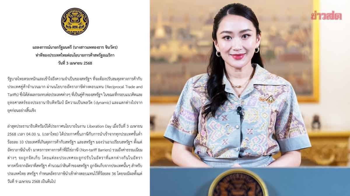 ထိုင်းဝန်ကြီးချုပ် Paetongtarn Shinawatra သည် ဧပြီလ ၃ ရက် ကြာသပတေးနေ့တွင် ထိုင်းသည် နှစ်နိုင်ငံစလုံးအတွက် တရားမျှတသောကုန်သွယ်မှုသေချာစေရန်အတွက် အမေရိကန်ကုန်ပစ္စည်းများအပေါ် ချမှတ်ထားသော အခွန်စည်းကြပ်မှုများကို ညှိနှိင်းပြင်ဆင်ရန် အဆင်သင့်ရှိကြောင်း ကြေငြာချက်ထုတ်ပြန်ခဲ့သည်။ ထိုင်းနိုင်ငံအပါအဝင် နိုင်ငံအများအပြားအပေါ် အမေရိကန်သမ္မတ ဒေါ်နယ်ထရန့်က တန်ပြန်အကောက်ခွန် စည်းကြပ်ခွန်များ ချမှတ်ပြီးနောက် နာရီပိုင်းအကြာတွင် အဆိုပါ ကြေညာချက် ထွက်ပေါ်လာခြင်းဖြစ်သည်။ ထိုင်းနိုင်ငံသည် ဧပြီလ ၉ ရက်နေ့မှ စတင်၍ အာဆီယံတွင် အမြင့်ဆုံးဖြစ်သည့် Trump မှ စည်းကြပ်ခွန် ၃၆ ရာခိုင်နှုန်း ချမှတ်ခံရမည် ဖြစ်သည်။