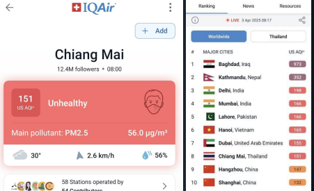ထိုင်းနိုင်ငံ၊ ချင်းမိုင်သည် ဧပြီလ ၃ ရက် ကြာသပတေးနေ့ နံနက်တွင် ကမ္ဘာ့လေထုညစ်ညမ်းမှုအရှိဆုံးမြို့များအနက် နံပါတ် ၈ တွင်ရှိပြီး ဘန်ကောက်သည် နံပါတ် ၇၀ ရှိကြောင်း IQAir အက်ပ်၏အဆိုအရ သိရသည်။ ချင်းမိုင်သည် ယခု ခြောက်ရက်ဆက်တိုက် Top 10 တွင် ရှိနေသည်။