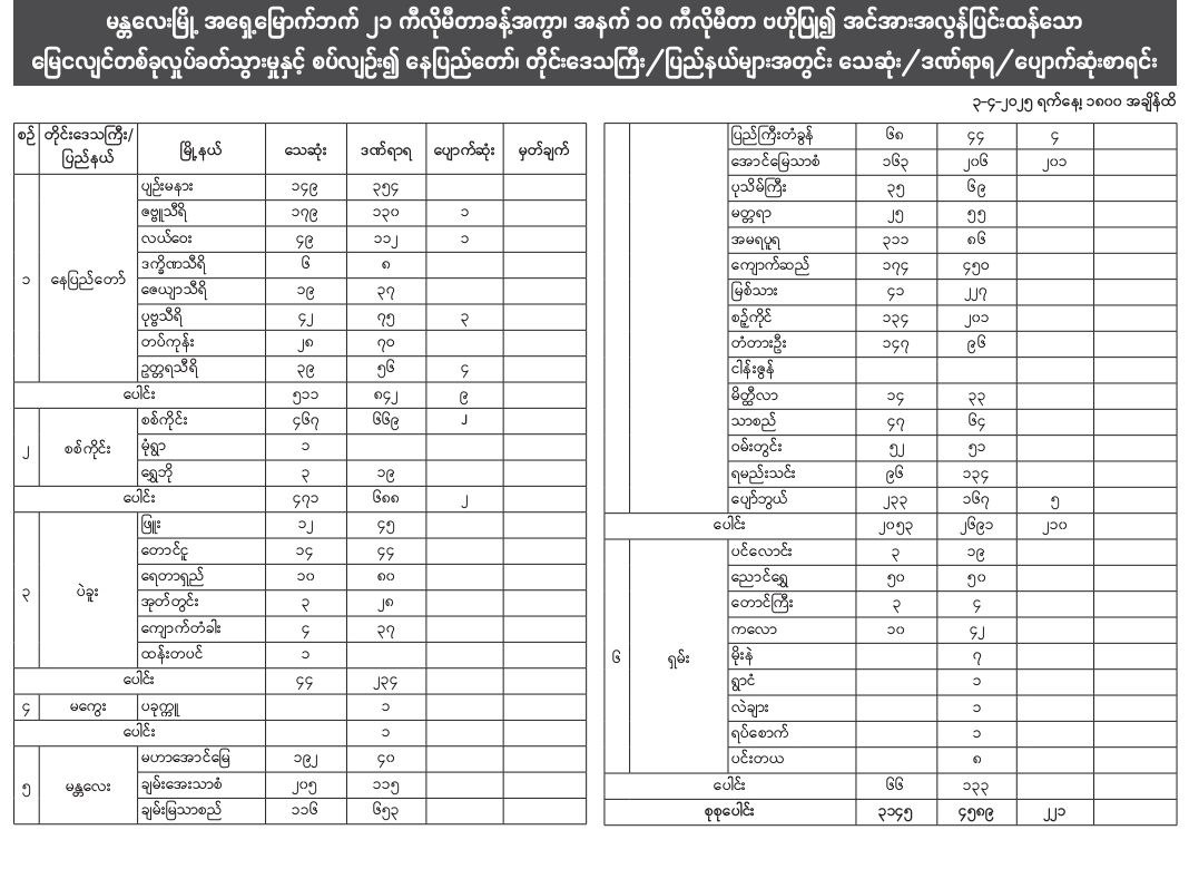 (၃-၄-၂ဝ၂၅ ရက်နေ့၊ ၁၈နာရီ၀၀ အချိန်ထိ)မန္တလေးမြို့ အရှေ့မြောက်ဘက် ၂၁ ကီလိုမီတာခန့်အကွာ၊ အနက် ၁၀ ကီလိုမီတာ ဗဟိုပြု၍ အင်အားအလွန်ပြင်းထန်သော မြေငလျင်တစ်ခုလှုပ်ခတ်သွားမှုနှင့် စပ်လျဉ်း၍ နေပြည်တော်၊ တိုင်းဒေသကြီး/ပြည်နယ်များအတွင်း သေဆုံး/ဒဏ်ရာရ/ပျောက်ဆုံးစာရင်းထွက်ပေါ်လာခဲ့ပါတယ်။