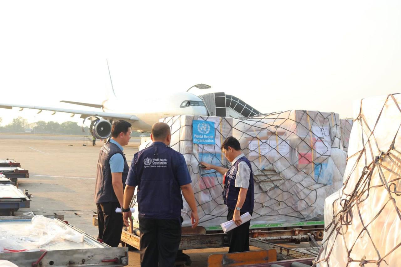 ကမ္ဘာ့ကျန်းမာရေးအဖွဲ့အစည်း(WHO)က မြန်မာနိုင်ငံရှိ ငလျင်ဘေးဒဏ်သင့် ပြည်သူများ ကူညီကယ်ဆယ်ရေး အတွက် အရေးပေါ် ကျန်းမာရေးပစ္စည်းများ ထောက်ပံ့ပေးပို့ခဲ့သည်။ WHO မှ ထောက်ပံ့သည့် အရေးပေါ် ကျန်းမာရေးပစ္စည်းများ တန်ချိန် ၃၅ တန်သည် ဧပြီ ၃ ရက်နေ့က မြန်မာနိုင်ငံ သို့ ရောက်ရှိခဲ့သည်။