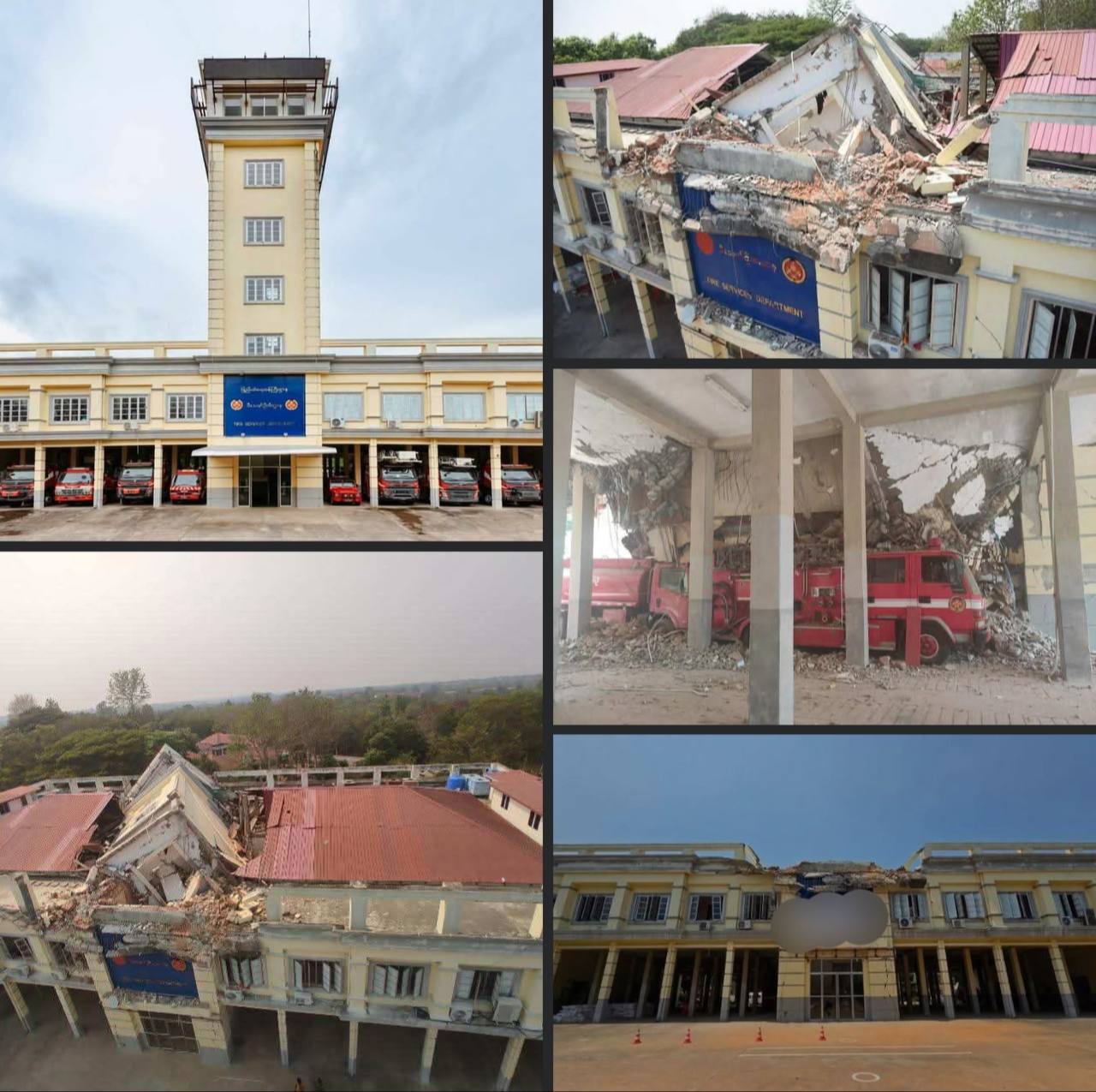 အင်အားပြင်းငလျင်ကြောင့် နေပြည်တော်ရှိ မီးသတ်ရုံးချုပ်နှင့်မီးသတ်ဦးစီးမှူးရုံး မျှော်စင်ပြိုကျရာ ကလေးငယ်တစ်ဦး ကွယ်လွန်ပြီး မီးသတ်တပ်ဖွဲ့ဝင် ရှစ်ဦး ဒဏ်ရာရရှိသည်ဟု မြန်မာနိုင်ငံမီးသတ်တပ်ဖွဲ့က ထုတ်ပြန်သည်။ပြိုကျပျက်စီးခဲ့သော မီးသတ်ဦးစီးဌာန (နေပြည်တော်)ရုံးချုပ်နှင့် နေပြည်တော်မီးသတ်ဦးစီးမှူးရုံး အဆောက်အအုံပေါ်ရှိ ငါးထပ် မီးသတ်မျှော်စင်နှင့် မီးသတ်ရုံးကြီးအား ဧပြီ ၅ ရက်တွင် အန္တရာယ်ရှိ အဆောက်အဦးအပေါ်ပိုင်း အစိတ် အပိုင်း များအား ဖြိုချဖျက်စီး ရှင်းလင်းဖယ်ရှားမည်ဖြစ်သည်။