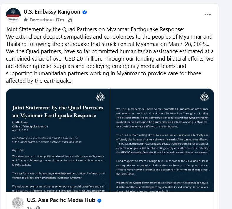 မြန်မာနိုင်ငံတွင် ပြင်အား ၇ ဒသမ ၇ အဆင့်ရှိ ငလျင်လှုပ်ခတ်မှုကြောင့် ထိခိုက်ခံစားခဲ့ရသော ပြည်သူလူထုများ အတွက် ကူညီကယ်ဆယ်ရေးလုပ်ငန်းများ ဆောင်ရွက်နိုင်ရန်အတွက် Quad ကနေ အမေရိကန် ဒေါ်လာ သန်း ၂၀ ကူညီထောက်ပံ့ပေးသွားမည်ဟု ၂၀၂၅ ခုနှစ်၊ ဧပြီ ၄ ရက်တွင် ပူးတွဲထုတ်ပြန်ခဲ့သည်။Quad တွင် အမေရိကန်၊ ဩစတြေးလျ၊ ဂျပန်၊ အိန္ဒိယ စသည့် လေးနိုင်ငံစုစည်း၍ ဖွဲစည်းထားသော မဟာမိတ် အဖွဲ့ဖြစ်သည်။ လက်ရှိ မြန်မာနိုင်ငံတွင် Quad အဖွဲ့ဝင် အိန္ဒိယနိုင်ငံက ကျန်းမာရေးစောင့်ရှောက်မှုပေးသည့် အဖွဲ့များနှင့် ပိတ်မိ နေသော ပြည်သူများ ကယ်ဆယ်ရေးလုပ်ပေးမည့်အဖွဲ့များကို စေလွှတ်၍ မြန်မာငလျင်ဘေးကို ထောက်ပံ့ကူညီ လျက်ရှိသည်။တခြားသော နိုင်ငံများဖြစ်သည့် ရုရှား၊ ဂျပန်၊ တရုတ်၊ ထိုင်း၊ ဘူတန်၊ လာအို၊ ဗီယက်နမ်၊ စင်္ကာပူ၊ ဘင်္ဂလားဒေ့ရှ်၊ ဟောင် ကောင် တို့ကလည်း ကူညီကယ်ဆယ်ရေးအဖွဲ့များ စေလွှတ်၍ ပိတ်မိနေသူများ ကယ်ထုတ်ရေးနှင့် ကျန်းမာရေး စောင့်ရှောက်မှုများ ပေးအပ်လျက်ရှိသည်။