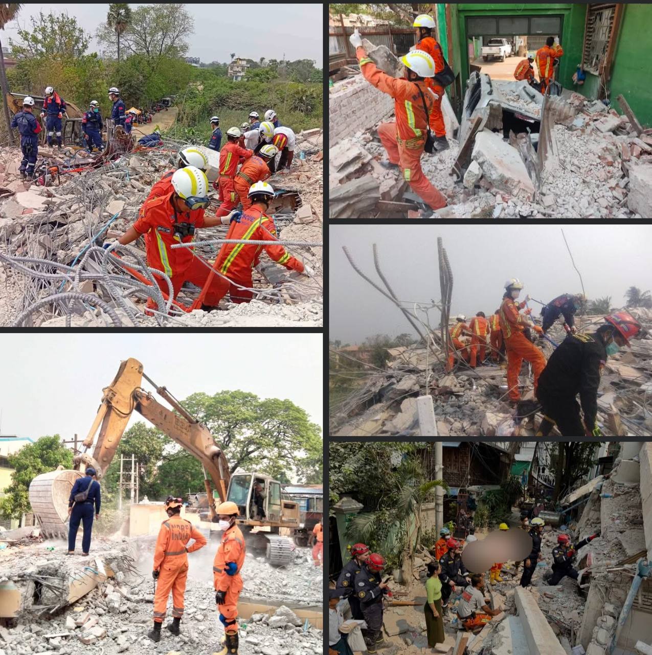 အင်အားပြင်းငလျင်လှုပ်ခတ်မှုကြောင့် မန္တလေးတိုင်းဒေသကြီးအတွင်း ပြိုကျပျက်စီးလျက်ရှိသော အဆောက်အဦးများတွင် ပိတ်မိနေသူများအား မြန်မာနိုင်ငံမီးသတ်တပ်ဖွဲ့မှ ဦးဆောင်သော ရှာဖွေကယ်ဆယ်ရေးတပ်ဖွဲ့ဝင်များမှ ဌာနဆိုင်ရာများ၊ ပရဟိတအဖွဲ့များ၊ လူမှုကူညီရေးအသင်းများ၊ ပြည်သူများနှင့် နိုင်ငံတကာမှ ရှာဖွေကယ်ဆယ်ရေးအဖွဲ့များ ပူးပေါင်း၍ ရှာဖွေကယ်ဆယ်ရေးလုပ်ငန်းများ ဆောင်ရွက်ခဲ့ရာ စတင်ဖြစ်ပွားချိန်မှ ဧပြီ ၄ ရက်အထိ မန္တလေးတိုင်းဒေသကြီးအတွင်း အမျိုးသား ၂၁၇ ဦး အမျိုးသမီး ၁၈၇ ဦး စုစုပေါင်း ၄၀၄ ဦးအား အသက်ရှင်လျက်ကယ်ဆယ်နိုင်ခဲ့ပြီး အမျိုးသား ၂၀၃ ဦး ၊ အမျိုးသမီး ၁၅၅ ဦး စုစုပေါင်း ၃၅၈ ဦးတို့၏ ရုပ်အလောင်းများအား ရှာဖွေတွေ့ရှိခဲ့ကြောင်း မြန်မာနိုင်ငံမီးသတ်တပ်ဖွဲ့က သတင်းထုတ်ပြန်သည်။