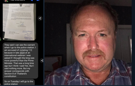တော်ဝင်အသရေဖျက်မှုဖြင့် သူအခြေစိုက်ရာ Phitsanuloke ပြည်နယ်တွင် 2025 ခုနှစ် ဧပြီလ 4 ရက်နေ့တွင် အမေရိကန်ပညာရှင် Paul Chambers ကို ရဲများက ဖမ်းဆီးရန် ကြိုးပမ်းခဲ့သည်။ Chambers က မတ်လ ၄ ရက် ယနေ့ မွန်းတည့်တွင် ၎င်းသည် အပြစ်မရှိကြောင်းနှင့် ဧပြီလ ၁ ရက် အင်္ဂါနေ့တွင် Phitsanuloke ခရိုင် Muang ရဲစခန်းတွင် ရဲတပ်ဖွဲ့က ၎င်းအား ပုတ်ခတ်ပြောဆိုသည့် စွဲချက်များအား ရှင်းပြရန် ညှိနှိင်းခဲ့ကြောင်း သိရသည်။