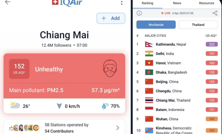 ထိုင်းနိုင်ငံ၊ ချင်းမိုင်သည် သောကြာနေ့နံနက်တွင် ကမ္ဘာ့လေထုညစ်ညမ်းမှုအရှိဆုံးမြို့များအနက် နံပါတ် ၇ တွင်ရှိပြီး ဘန်ကောက်သည် နံပါတ် ၇၅ တွင်ရှိကြောင်း IQAir အက်ပ်၏အဆိုအရ သိရသည်။ ချင်းမိုင်သည် ယခု 7 ရက်ဆက်တိုက် ထိပ်ဆုံး 10 တွင် ရှိနေသည်။