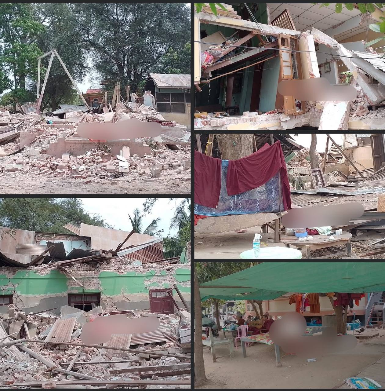 စစ်ကိုင်းတောင်ရိုးရှိ ရွှေဟင်္သာတိုက်သစ် ဘုန်းတော်ကြီးကျောင်းတွင် ငလျင်ဒဏ်ကြောင့် ဘုန်းကြီးကျောင်းဆောင်ပေါင်း ၃၀ ကျော် ပြိုကျပျက်စီးခဲ့ပြီး သံဃာတစ်ပါး ၊ ကိုရင်ငါးပါး နှင့် လူပုဂ္ဂုလ် ၁၂ ဦး ၊ စုစုပေါင်း သေဆုံးသူ ၁၈ ဦးရှိခဲ့ကြောင်း သိရှိရသည် ။လက်ရှိတွင် ပြိုကျပျက်စီးခဲ့သည့် ကျောင်းဆောင်များကို ရှင်းလင်းဆောင်ရွက်မှုများ ပြုလုပ်လျက်ရှိပြီး တစ်ထပ်ကျောင်းဆောင်များ ပြန်လည်ဆောက်လုပ်ရန် လျာထားကြောင်း ဆရာတော်က ဆက်လက်မိန့်ကြားခဲ့သည် ။လတ်တလောတွင် သံဃာတော်များနေထိုင်သီတင်းသုံးရန် နေရာအခက်အခဲ မရှိသော်လည်း လေမိုးကျလာပါက အခက်အခဲရှိနိုင်သည်ဟု ဆရာတော်က မိန့်ကြားခဲ့သည် ။