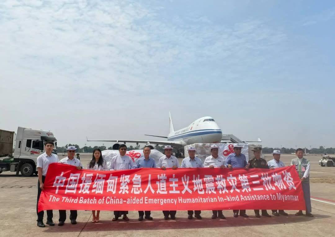 ငလျင်ဒဏ်သင့်ဒေသများအတွက် တရုတ်နိုင်ငံအစိုးရမှပေးပို့သည့် လူသားချင်းစာနာထောက်ထားမှုဆိုင်ရာ အကူအညီပစ္စည်းများ ယမန်နေ့ ဧပြီ ၅ ရက်က တတိယအသုတ်အဖြစ် ထပ်မံရောက်ရှိလာကြောင်း သိရသည်။ အဆိုပါ အကူအညီပစ္စည်းများတင်ဆောင်လာသည့် လေယာဥ်သည် ရန်ကုန်လေဆိပ်သို့ဆိုက်ရောက်ခဲ့ရာ ရန်ကုန်တိုင်းဝန်ကြီးချုပ်ဦးစိုးသိန်း၊ မြန်မာနိုင်ငံဆိုင်ရာ တရုတ်သံရုံး၏ သံမှူးနှင့် တာဝန်ရှိသူများက ကြိုဆိုခဲ့ကြကြောင်း သိရသည်။