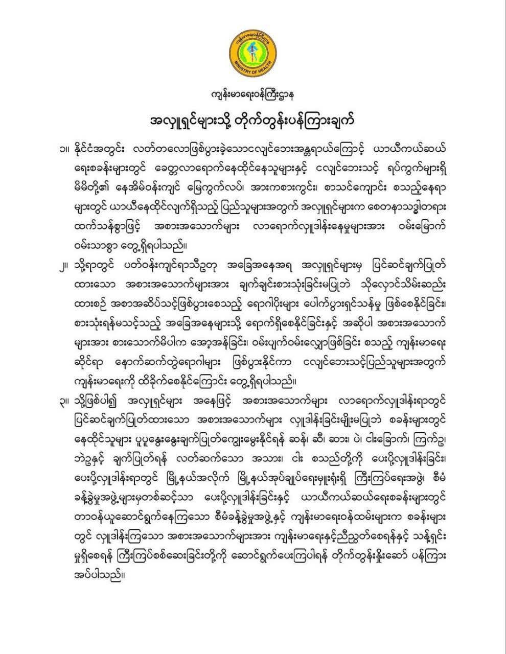 ပြည်တွင်း၌ငလျင်ဒေသသင့် ပြည်သူများထံသို့ အလှူရှင်များအနေဖြင့် အစားအသောက်များလှူဒါန်းရာတွင် ပြင်ဆင်ချက်ပြုတ်ထားသော အစားအသောက်မျိုးမဟုတ်ဘဲ ကုန်ခြောက်များကိုသာ လှူဒါန်းရန် ကျန်းမာရေးဝန်ကြီးဌာနက တိုက်တွန်းထုတ်ပြန်ထားပါတယ်။အဆိုပါထုတ်ပြန်ထားချက်အရပတ်ဝန်းကျင်ရာသီဥတု အခြေအနေအရ အလှူရှင်များမှ ပြင်ဆင်ချက်ပြုတ်ထားသော အစားအသောက်များအား ချက်ချင်းစားသုံးခြင်းမပြုဘဲ သိုလှောင်သိမ်းဆည်းထားစဉ် အစာအဆိပ်သင့်မှုကိုဖြစ်ပွားစေသည့် ရောဂါပိုးများ ပေါက်ပွားရှင်သန်နိုင်ခြင်း၊ စားသုံးရန်မသင့်သည့် အခြေအနေများသို့ ရောက်ရှိစေနိုင်ခြင်းနှင့် အဆိုပါ အစားအသောက်များအား စားသောက်မိပါက အော့အန်ခြင်း၊ ဝမ်းပျက်ဝမ်းလျှောဖြစ်ခြင်း စသည့် ကျန်းမာရေးဆိုင်ရာ နောက်ဆက်တွဲရောဂါများ ဖြစ်ပွားနိုင်ကာ ငလျင်ဘေးသင့်ပြည်သူများအတွက် ကျန်းမာရေးကို ထိခိုက်စေနိုင်ရာအလှူရှင်များ အနေဖြင့် အစားအသောက်များ လာရောက်လှူဒါန်းရာတွင် ပြင်ဆင်ချက်ပြုတ်ထားသော အ စားအသောက်များ လှူဒါန်းခြင်းမျိုးမပြုဘဲ စခန်းများတွင် နေထိုင်သူများ ပူပူနွေးနွေးချက်ပြုတ်ကျွေးမွေးနိုင်ရန် ဆန်၊ ဆီ၊ ဆား၊ ပဲ၊ ငါးခြောက်၊ ကြက်ဥ၊ ဘဲဥနှင့် ချက်ပြုတ်ရန် လတ်ဆတ်သော အသား၊ ငါး စသည်တို့ကို ပေးပို့လှူဒါန်းရန် တိုက်တွန်းထားပါတယ်။