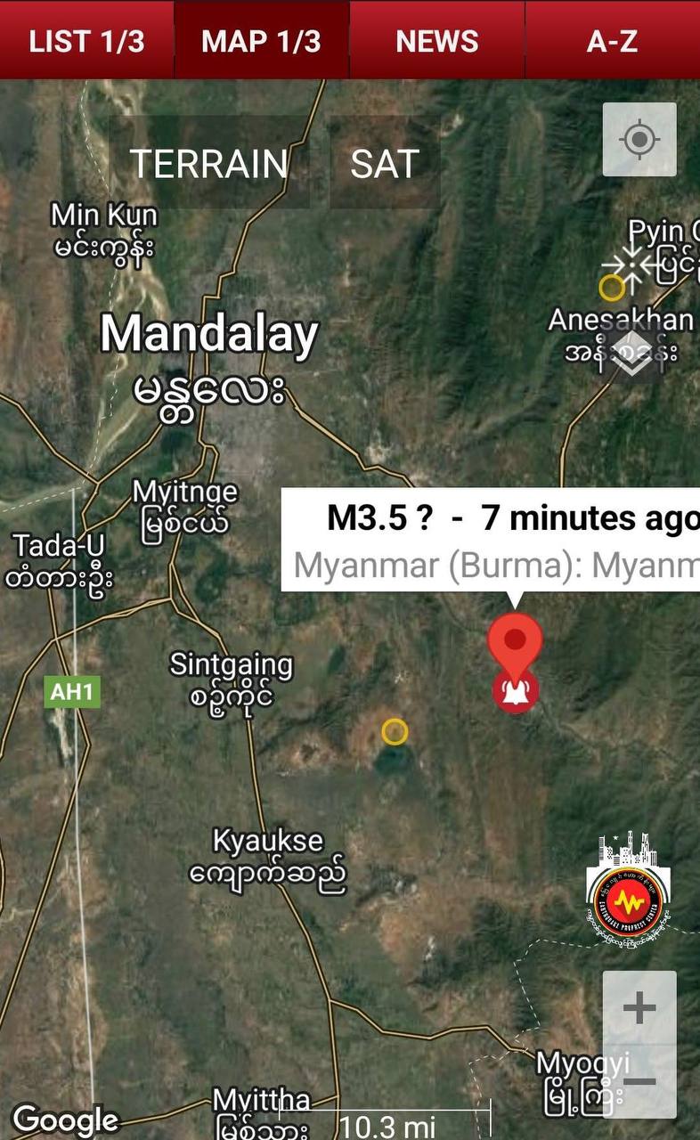 ယနေ့ညနေ မြန်မာစံတော်ချိန် ၇:၂၅ နာရီအချိန်က မန္တလေးမြိုမှ အရှေ့တောင်ဘက်ပိုင်း၊ ကျောက်ဆည်အရှေ့မြောက်ဘက် ၁၅ မိုင်၊ စဉ့်ကိုင်အရှေ့ဘက် ၁၁ မိုင်အကွာ မြေအောက်အနက် ၉ မိုင်မှ မဂ္ဂနီကျု ၃.၅ အဆင့်မြေငလျင်ငယ် ထပ်မံလှုပ်ရှားသွားခဲ့သည်။