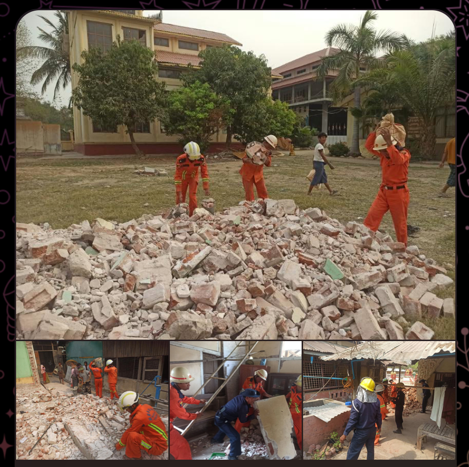 အင်အားပြင်းငလျင်လှုပ်ခတ်ခဲ့မှုကြောင့် မန္တလေးတိုင်းဒေသကြီး၊ ပျော်ဘွယ်မြို့နယ်အတွင်း မြေငလျင်ဘေးသင့်ခဲ့သော ယင်းတော်ရွာမကျေးရွာရှိ ယင်းတော်မင်းဘုန်းတော်ကြီးကျောင်းတိုက်နှင့် ယင်းတော်မြို့မကျေးရွာရှိ ပတ္တမြားရွှေဂူဘုရားဝန်းအတွင်းရှိ ပြိုကျပျက်စီးသည့် အဆောက်အဦများအား ၆.၄.၂၀၂၅ ရက်နေ့တွင် ပျော်ဘွယ်မြို့နယ်/နယ်မြေမီးသတ်စခန်းမှ သန္ဓေမီးသတ်တပ်ဖွဲ့ဝင်များ၊ အရန်မီးသတ်တပ်ဖွဲ့ဝင်များဖြင့် ကူညီရွှေ့ပြောင်းခြင်း၊ ရှင်းလင်းခြင်းနှင့် ပြန်လည်ထူထောင်ခြင်းလုပ်ငန်းများ ဆောင်ရွက်လျက်ရှိပါသည်။