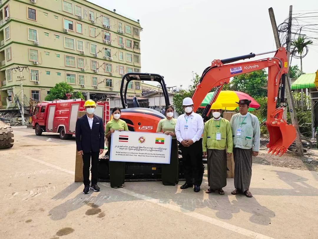 ငလျင်ဒဏ်သင့် မန္တလေးမြို့၌ပျက်စီးနေသည့် အဆောက်အဦးများအား ရှင်းလင်းရာတွင်အသုံးပြုရန် ထိုင်း-မြန်မာချစ်ကြည်ရေးအသင်းမှ ဘတ်(၁၀) သိန်းတန်ဖိုးရှိ မြေတူးကားတစ်စီးအား ဧပြီ ၆ ရက်မွန်းလွဲပိုင်းကလှူဒါန်းခဲ့ကြောင်း မြန်မာနိုင်ငံဆိုင်ရာ ထိုင်းသံရုံးထံမှ သိရသည်။အဆိုပါ မြေတူးကားအား ထိုင်းသံအမတ်ကြီး H.E. Mr. Mongkol Visitstump က မန္တလေးတိုင်းအစိုး ရအဖွဲ့ လူမှုဝန်ထမ်းကယ်ဆယ်ရေးနှင့်ပြန်လည်နေရာချထားရေးဝန်ကြီးထံ လွှဲပြောင်းလှူဒါန်းပေးခဲ့ကြောင်း သိရသည်။ထို့ပြင် CP Motor Myanmar ကုမ္ပဏီမှ Tent (၂) ဒါဇင်နှင့် MK Distribution ကုမ္ပဏီမှ အသင့်စားမာမားခေါက်ဆွဲထုပ် (၄၅၀၀၀)တို့ကို မန္တလေးမြို့ရှိငလျင်ဒဏ်သင့်သူများအတွက် မန္တလေးတိုင်းအစိုးရ အဖွဲ့ထံ ပေးအပ်လှူဒါန်းခဲ့ကြကြောင်း သိရသည်။