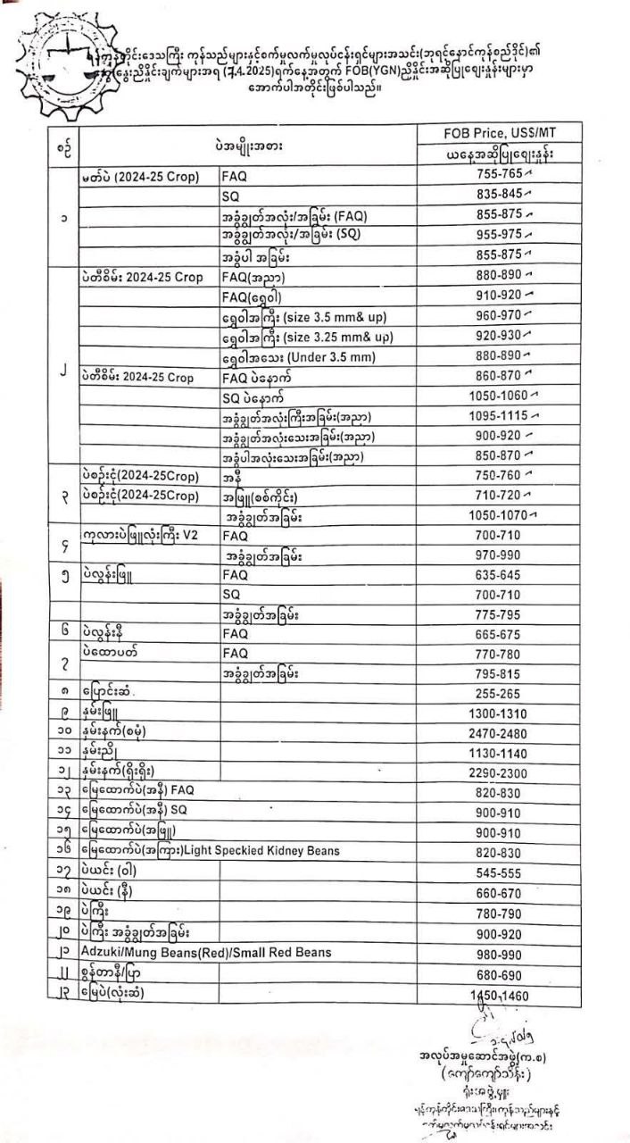 ရန်ကုန်တိုင်းဒေသကြီး ကုန်သည်များနှင့်စက်မှုလက်မှု လုပ်ငန်းရှင်များအသင်း (ဘုရင့်နောင်ကုန်စည်ဒိုင်)၏ (7.4.2025) ရက်နေ့ FOB ဈေးနှုန်းစာရင်းမှာ အောက်ပါအတိုင်းဖြစ်ပါသည်။