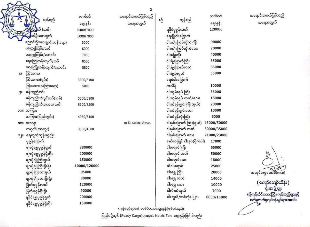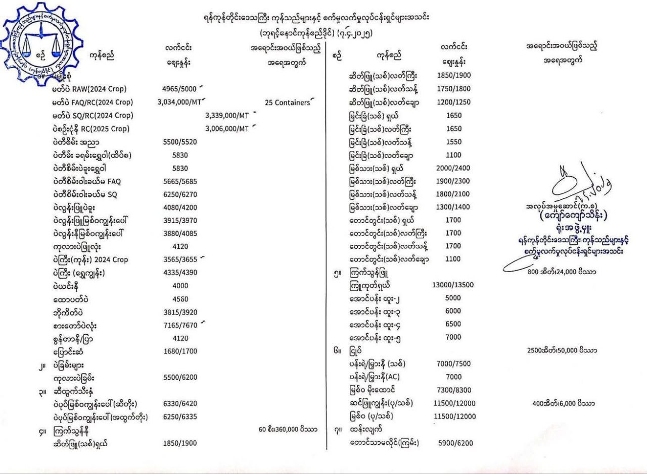 ရန်ကုန်တိုင်းဒေသကြီး ကုန်သည်များနှင့်စက်မှုလက်မှုလုပ်ငန်းရှင်များ အသင်း (ဘုရင့်နောင်ကုန်စည်ဒိုင်)၏7.4.2025 ရက်နေ့ Local Price ဈေးနှုန်းစာရင်း။