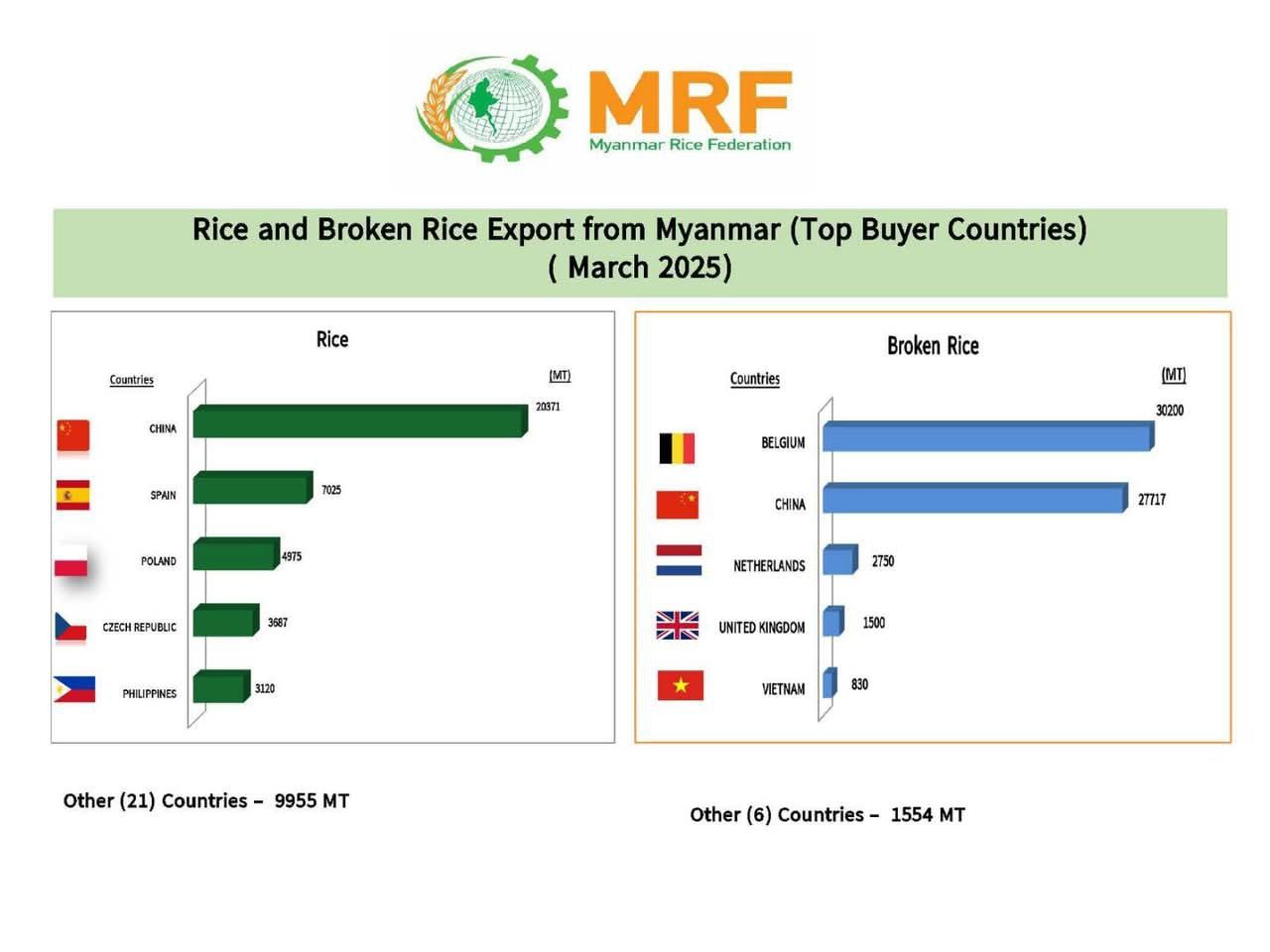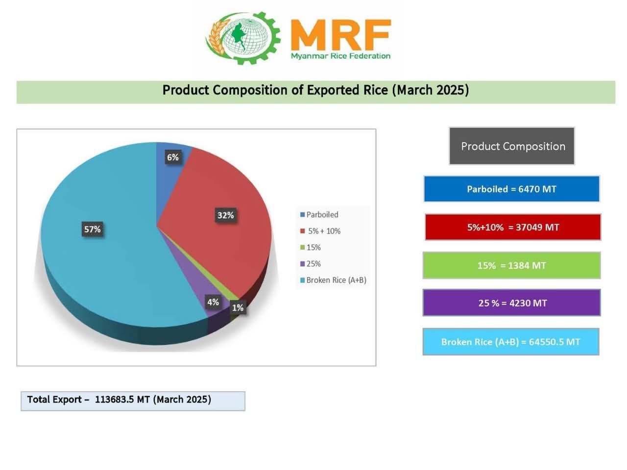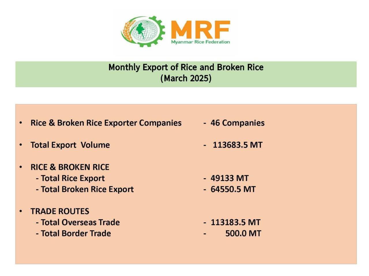မြန်မာနိုင်ငံဆန်စပါးအသင်းချုပ်၏ စာရင်းမှတ်တမ်းများအရ ၂၀၂၄-၂၀၂၅ ဘဏ္ဍာရေးနှစ်၊ မတ်လအတွင်း ဆန်/ ဆန်ကွဲ ပြည်ပတင်ပို့ထားမှု အခြေအနေမှာ အောက်ပါအတိုင်းဖြစ်ပါသည်။