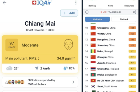 ထိုင်းနိုင်ငံ၊ ချင်းမိုင်သည် ဧပြီလ ၇ ရက် တနင်္လာနေ့ နံနက်တွင် ကမ္ဘာ့လေထုအညစ်ညမ်းဆုံးမြို့များအနက် နံပါတ် ၁၇ တွင်ရှိပြီး ဘန်ကောက်သည် နံပါတ် 50 ရှိကြောင်း IQAir အက်ပ်၏အဆိုအရ သိရသည်။ ချင်းမိုင်သည် Top 10 တွင် 9 ရက်ဆက်တိုက် ရပ်တည်နေသော်လည်း ယနေ့ Top 10 တွင် ပါဝင်ခဲ့သည်။ ချင်းမိုင်နှင့် ဘန်ကောက် နှစ်ခုစလုံးသည် ယနေ့ လေထုအရည်အသွေး အလယ်အလတ်ရှိသည်။