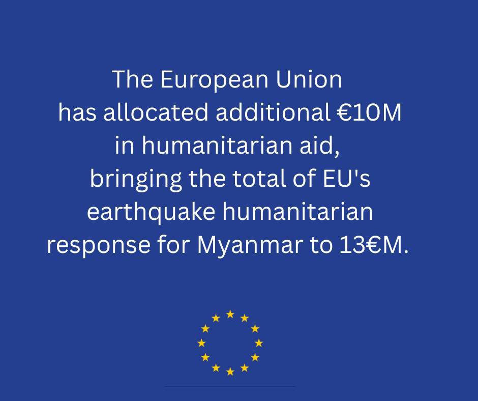 မြန်မာနိုင်ငံတွင် ငလျင်ဘေးသင့် ပြည်သူများ ပြန်လည်ထူထောင်ရေးနှင့် ကူညီကယ်ဆယ်ရေးအတွက် ဥရောပသမဂ္ဂ(EU)က ယူရို ၁၀ သန်း ထပ်မံ ထောက်ပံ့ပေးမည်ဖြစ်ကြောင်း ၂၀၂၅ ခုနှစ်၊ ဧပြီ ၇ ရက်တွင် ထုတ်ပြန်ခဲ့သည်။ ဤရန်ပုံငွေသည် မြန်မာနိုင်ငံတွင် လှုပ်ခတ်ခဲ့သော ငလျင်အတွက် ဥရောပသမဂ္ဂ၏ လူသားချင်းစာနာထောက်ထားမှုဆိုင်ရာ အကူအညီ စုစုပေါင်း ယူရို ၁၃ သန်း အထိ ရောက်ရှိခဲ့ပြီဖြစ်ပြီး ၂၀၂၅ ခုနှစ်အတွက် လူသားချင်းစာနာထောက်ထားမှုဆိုင်ရာ အကူအညီလျာထားချက် ယူရို ၄၆ သန်း၏ တစိတ်တဒေသ ဖြစ်သည်ဟု ထုတ်ပြန်ခဲ့သည်။