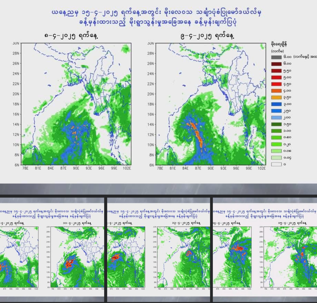 ယနေ့ ဧပြီလ ၇ ရက်နေ့ညမှ ဧပြီ ၁၁ ရက်နေ့အထိ နေပြည်တော်၊ ရန်ကုန်တိုင်းဒေသကြီး၊ မန္တလေး တိုင်းဒေသကြီး၊ ပဲခူးတိုင်းဒေသကြီး၊ မကွေးတိုင်းဒေသကြီး၊ ဧရာဝတီတိုင်းဒေသကြီး၊ ကယားပြည်နယ်၊ ကရင်ပြည်နယ်၊ မွန်ပြည်နယ်၊ ရခိုင်ပြည်နယ်နှင့် ရှမ်းပြည်နယ်တို့တွင် နေရာကျဲကျဲမှ နေရာစိပ်စိပ် မိုးရွာသွန်းနိုင်ပြီး စစ်ကိုင်းတိုင်းဒေသကြီး၊ တနင်္သာရီတိုင်းဒေသကြီး၊ ကချင်ပြည်နယ်နှင့် ချင်းပြည်နယ်တို့တွင် နေရာ ကွက်ကျား မိုးထစ်ချုန်းရွာနိုင်သည်ဟု ဆိုသည်။ထို့ကြောင့် အချိန်အခါမဟုတ်မိုးရွာခြင်းနှင့်အတူ လေပြင်းများ တိုက်ခတ်ခြင်း၊ မိုးထစ်ချုန်းခြင်း၊ မိုးကြိုးပစ်ခြင်း၊ လျှပ်စီးလက်ခြင်း၊ မိုးသီးကြွေခြင်းနှင့် မြေပြိုခြင်းစသည့် မိုးလေဝသ ဖြစ်စဉ်များ ဖြစ်ပေါ်နိုင်၍ ကြိုတင်သတိပြုနိုင်ရန် မိုးဇလမှ သတိပေးထားသည်။