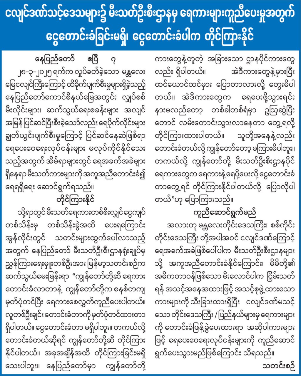 ငလျင်ဒဏ်သင့်ဒေသများ၌ မီးသတ်ဦးစီးဌာနမှ ရေကားများ ကူညီပေးမှုအတွက် ငွေတောင်းခံခြင်းမရှိ၊ ငွေတောင်းခံပါက တိုင်ကြားနိုင်ကြောင်း အောက်ပါအတိုင်းထုတ်ပြန်ထားပါသည်။