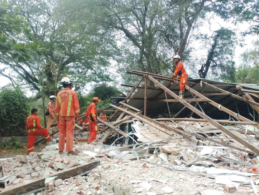 မန္တလေးတိုင်းဒေသကြီး၊ ပျော်ဘွယ်မြို့နယ်၊ ယင်းတော်ရွာမကျေးရွာ၊ ယင်းတော်မင်းကျောင်းတိုက် (ဓာတ်တော်တိုက်) အတွင်း ပြိုကျမှုအား ကယ်ဆယ်မှုပြုလုပ်နေ
