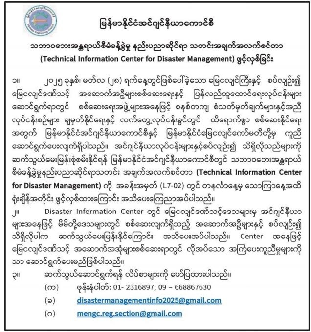 ပြည်တွင်း၌ ငလျင်အပြီး သဘာဝဘေးအန္တရာယ်စီမံခန့်ခွဲမှု နည်းပညာဆိုင်ရာ သတင်းအချက်အလက်စင်တာ (Technical Information Center for Disaster Management)ကို ဖွင့်လှစ်ခဲ့ပါတယ်။