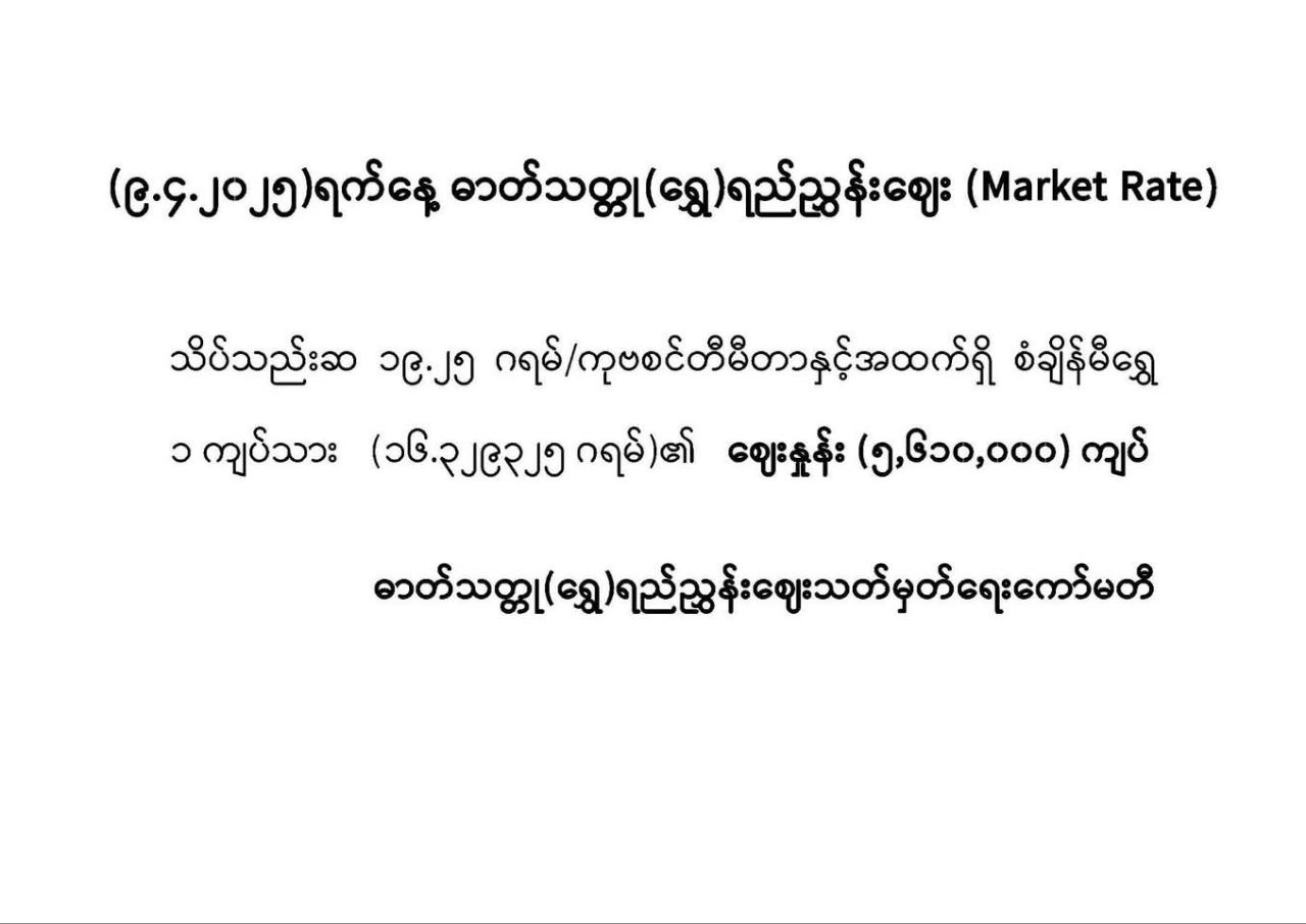 9.4.2025ရက်နေ့ရဲ့ ပြည်တွင်းဓာတ်သတ္တု(ရွှေ )ရည်ညွှန်းစျေး(Market Rate) မှာအောက်ပါအတိုင်းဖြစ်ပါသည်။