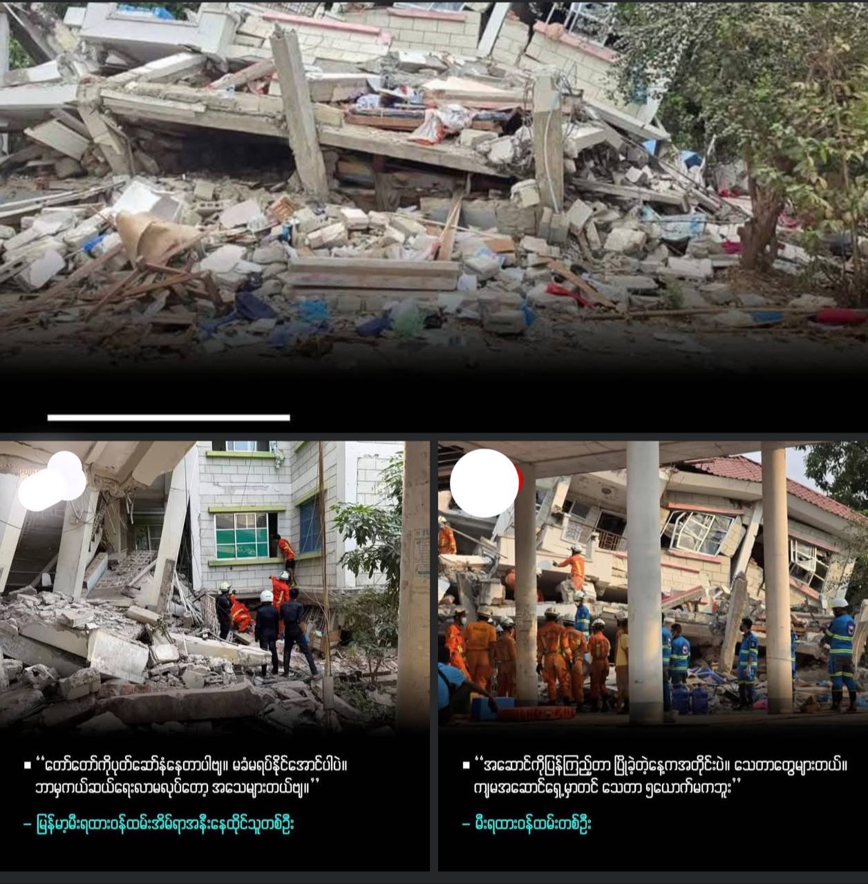 နေပြည်တော် မီးရထားဌာန နှင့် မွေးမြူရေးဌာန ဝန်ထမ်းအိမ်ယာများပြိုကျမှုတွင် သေဆုံးသူရုပ်အလောင်းများကို ယနေ့ (ဧပြီလ ၉ရက်)အထိ ပြန်ဖော်နိုင်ခြင်းမရှိသေးဘဲ ဘေးပတ်ဝန်းကျင်တွင် အပုတ်နံ့များထွက်နေသည်။အဆိုပါအိမ်ရာသည် ဇမ္ဗူသီရိမြို့နယ်၌ ရှိပြီး မတ်လ ၂၈ရက်က လှုပ်သော စစ်ကိုင်းငလျင်ကြီးကြောင့် ၄ ထပ်တိုက် အမှုထမ်းအိမ်ရာ ၂၅ လုံး၊ အရာထမ်းအိမ်ရာ ၁၇ လုံးမြေကျွံပြိုကျပျက်စီးခဲ့သည်ဟု ဝန်ထမ်းတစ်ဦးကပြောသည်။ စစ်ကောင်