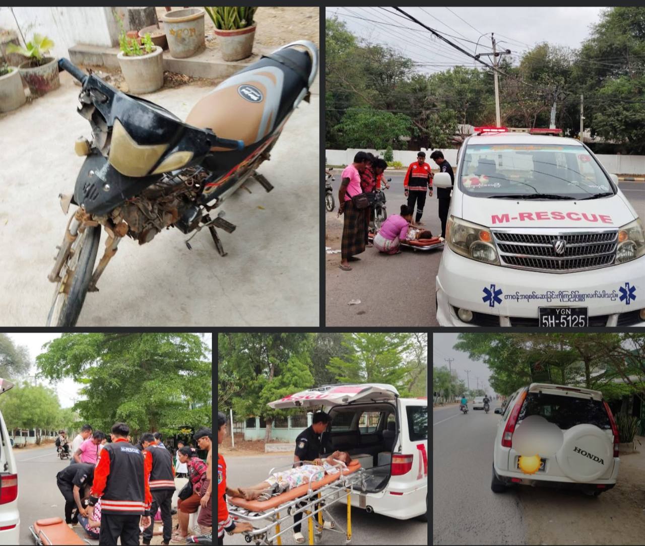 9.4.2025ရက်နေ့ (4:57 𝑷𝑴)အချိန်ကမကွေးမြို့ ၊နတ်မောက်လမ်းနှင့် သစ္စာလမ်းထောင့်တွင် ယာဉ်တိုက်မှုဖြစ်ပွါးနေပြီးဖြစ်စဥ်နေရာအရောက်တွင် ထိခိုက်ဒဏ်ရာရရှိသူအမျိုးသမီးတစ်ဦး (ဒူးပွန်းပဲ့ ၊ နှာခေါင်းသွေးလျှံ) အား မကွေးတိုင်းပြည်သူ့ဆေးရုံကြီး အရေးပေါ်ပြင်ပလူနာဌာနသို့ ကူညီပို့ဆောင်ခဲ့ကြောင်းကို𝑴 ~𝑹𝒆𝒔𝒄𝒖𝒆 𝑴𝒂𝒈𝒘𝒂𝒚 မြေပြင်လူမှုကူညီရေးအသင်းထံမှ သိရပါသည်။