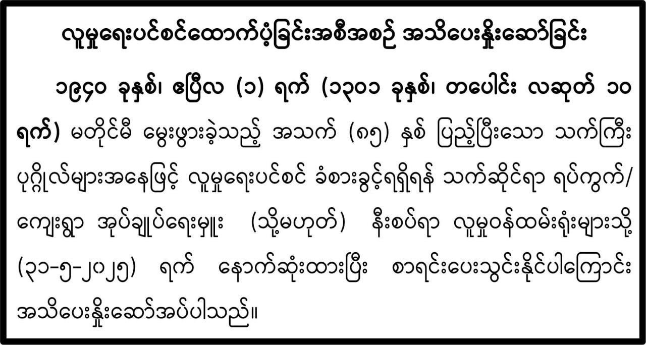 မြန်မာနိုင်ငံ လူမှုရေးပင်စင်ထောက်ပံ့ခြင်းအစီအစဉ် အသိပေးနှိုးဆော်ချက်