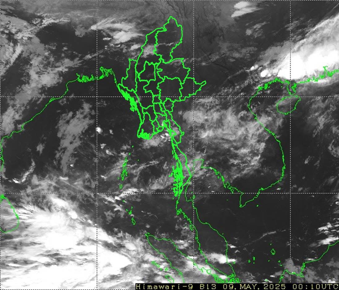 မိုးလေဝသညွှန်ကြားရေးဦးစီးဌာန ထုတ်ပြန်ချက်အရ၊ ယနေ့ မေလ ၉ ရက် နံနက် ၇:၀၀ နာရီအချိန်တွင် ဘင်္ဂလားပင်လယ်အော်တောင်ပိုင်းနှင့် အလယ်ပိုင်း၌ တိမ်ထူထပ်မှုရှိပြီး မြောက်ပိုင်းတွင် တိမ်အနည်းငယ်သာ ဖြစ်နေသည်။ ယနေ့ညနေအထိ နေပြည်တော်နှင့် တချို့တိုင်းဒေသကြီးများ၌ တိမ်အသင့်အတင့် ဖြစ်ထွန်းမည်ဖြစ်ပြီး တနင်္သာရီ၊ ကချင်၊ ကရင်နှင့် မွန်ပြည်နယ်များတွင် မိုးကျဲကျဲအထိ ရွာနိုင်ကြောင်း၊ မန္တလေးတွင် တိမ်ပြန့်ဖြစ်နိုင်ပြီး ရန်ကုန်၌ မိုးအနည်းငယ် ရွာနိုင်မည်ဟု ခန့်မှန်းထားသည်။