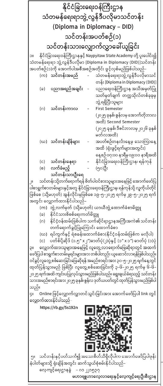 မြန်မာနိုင်ငံ နိုင်ငံခြား ရေးဝန်ကြီး ဌာနသံတမန်ရေးရာ ဘွဲ့လွန် ဒီပလိုမာသင်တန်း( Diploma in Diplomacy -DID)အပတ်စဥ် ( ၁ )သင်တန်း သားလျှောက်လွှာ ခေါ်ယူချက်မှာ အောက်ပါအတိုင်းဖြစ်ပါသည်။