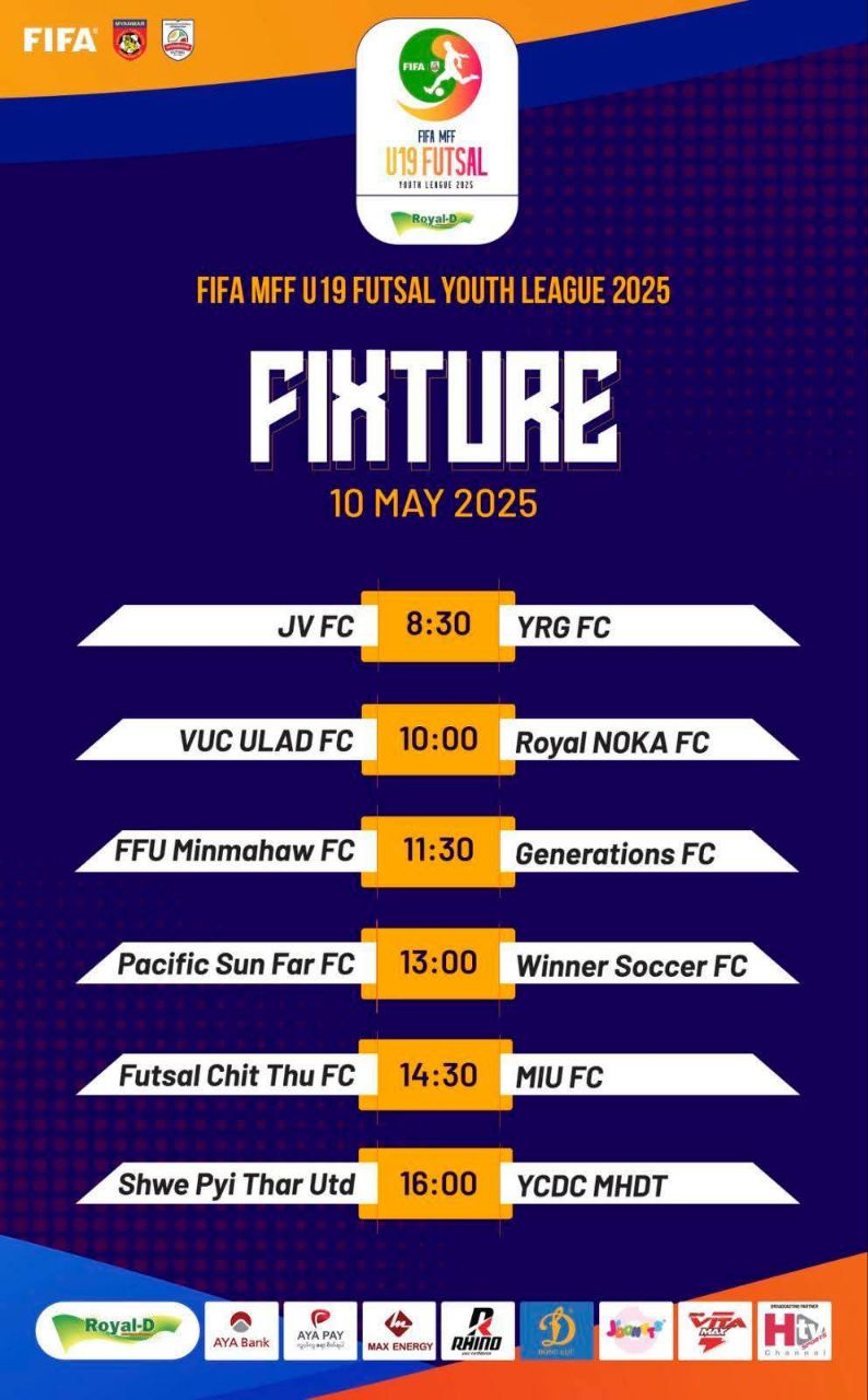 မေလ ၁၀ ရက်တွင် ယှဉ်ပြိုင်ကစားမည့် FIFA / MFF U-19 Futsal Youth League 2025 (Week -8) ပွဲစဉ်များ စာရင်းမှာ အောက်ပါအတိုင်းဖြစ်ပါတယ်။