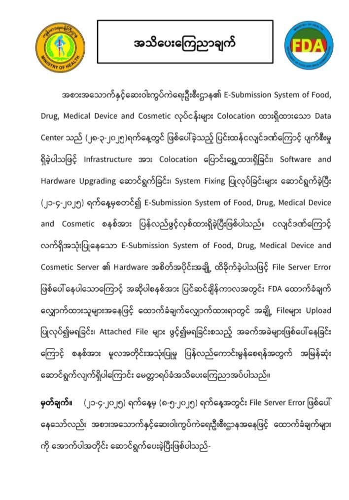 E-Submission နှင့် စပ်လျဉ်း၍ အစားအသောက်နှင့်ဆေးဝါးကွပ်ကဲရေးဦးစီးဌာန၏ အသိပေးကြေညာချက်မှာ အောက်ပါအတိုင်းဖြစ်ပါသည်။
