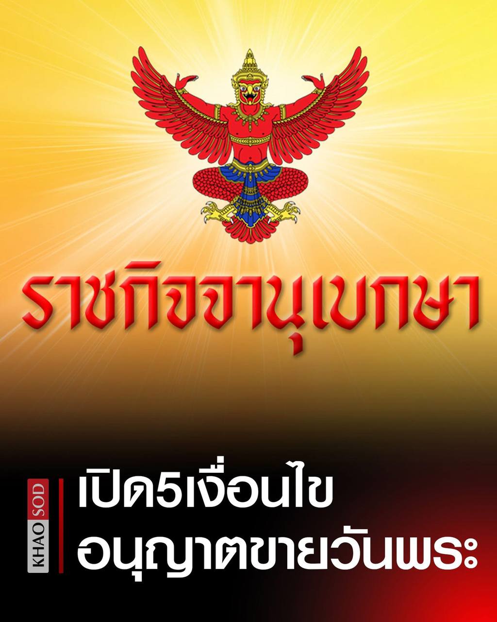 ထိုင်းတော်ဝင်ဂေဇက်သည် မေလ ၉ ရက်နေ့ ဗုဒ္ဓဘာသာ အားလပ်ရက်များတွင် အရက်နှင့် ဘီယာ ရောင်းချရန် ခွင့်ပြုချက်အသစ်ကို ထုတ်ပြန်ခဲ့ပြီး ခွင့်ပြုနိုင်သော အခြေအနေ ၅ ခုကို ဖော်ပြထားသည်။