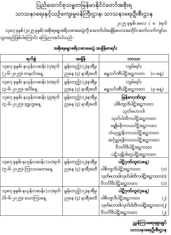 မတ်လ ၂၈ ရက်က လှုပ်ခတ်ခဲ့သော မန္တလေးငလျင်ကြီးကြောင့် ခေတ္တရွှေ့ဆိုင်းထားရသော ၂၀၂၅ ခုနှစ် အစိုးရဓမ္မာစရိယစာမေးပွဲနှင့် ပါဠိပထမပြန်စာမေးပွဲများကို ပြန်လည်ကျင်းပသွားမည်ဖြစ်ကြောင်း သာသနာရေးနှင့်ယဉ်ကျေးမှုဝန်ကြီးဌာန၊ သာသနာရေးဦးစီးဌာနမှ အသိပေးထုတ်ပြန်ထားသည်။