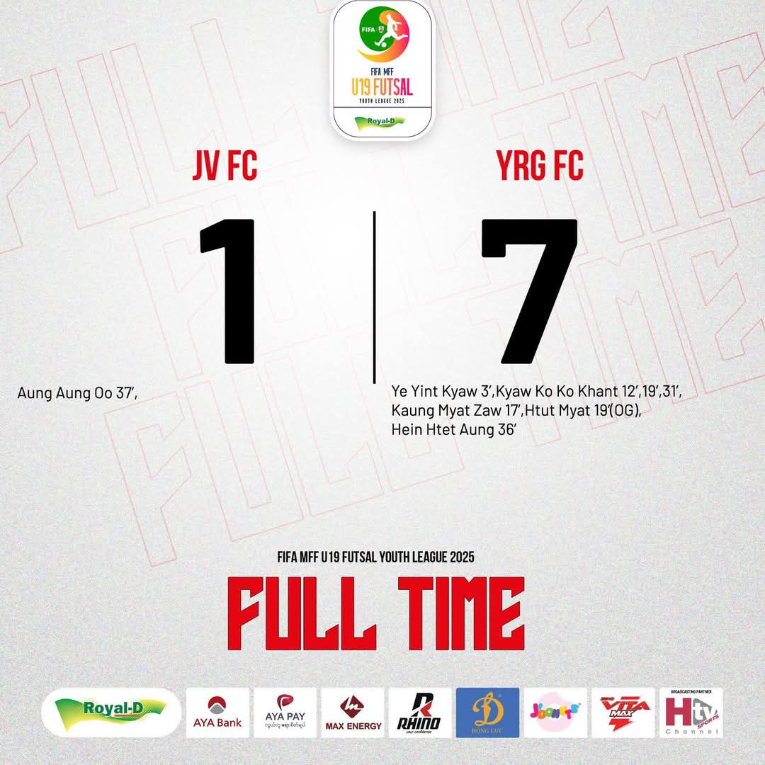 FIFA / MFF U-19 Futsal Youth League 2025 (Week -8)ပွဲစဉ်ရလဒ်ထွက်ပေါ်လာမှုမှာJV FC အသင်းမှ YRG FC အသင်းကို[FT]1-7ရလဒ်ဖြင့်ရှုံးနိမ့်ခဲ့ရပါတယ်။