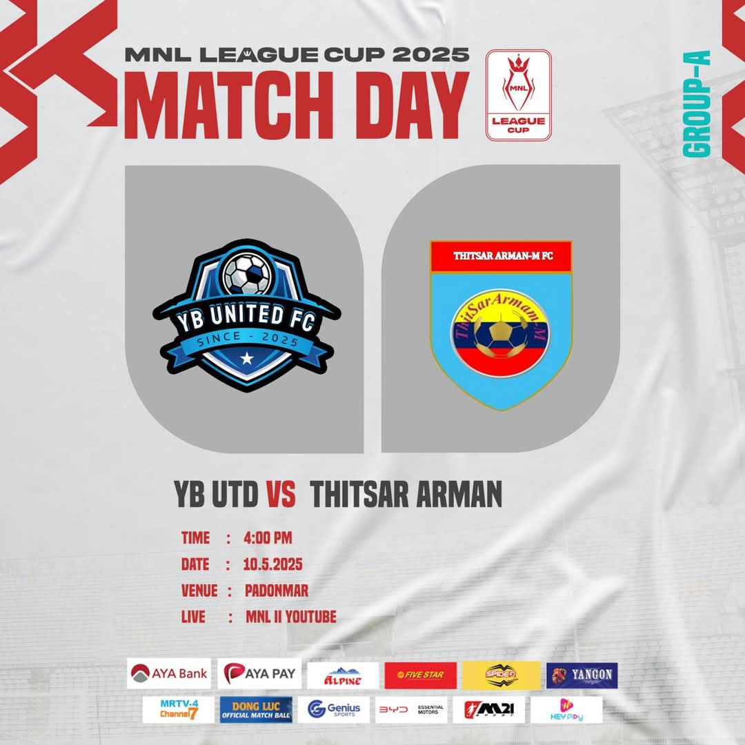 MNL League Cup 2025 ခုနှစ်ရဲ့Group Aပွဲစဉ်တွင်အုပ်စု(၂)ပွဲ ကစားအပြီး နိုင်ပွဲမရသေးတဲ့ ယန်းဘွိုင်းယူနိုက်တက်အသင်းနှင့် မြန်မာနေရှင်နယ်လိဂ် -၁ ကလပ် သစ္စာအားမာန်အသင်းတို့ ပွဲစဉ်ကိုယေန့တွင်ယှဥ်ပြိုင်ကစားသွားမှာဖြစ်ပါတယ်။@ Padonmarကွင်းတွင် ကစားသွားမှာဖြစ်ပြီးLive Streamအေနဖြင့်- MNL II YouTube ၊Live Stream- Myanmar National League II YouTubehttps://youtube.com/@nationalleagueii6488?si=Eun85FOH5ce6WkEbချန်နယ်တို့မှ ထုတ်လွှင့်ပြသသွားမှာလည်းဖြစ်ပါတယ်။
