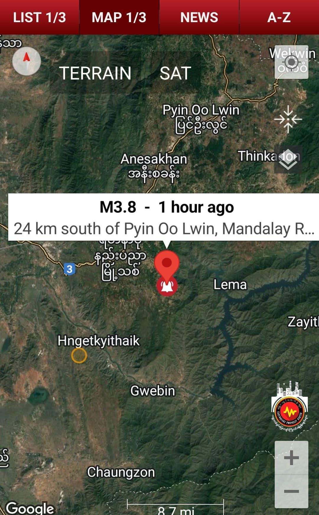 ၂၀၂၅ ခုနှစ် မေလ ၁၃ ရက် မနက် ၅:၅၁ နာရီအချိန်ခန့်တွင် မန္တလေးမြို့အရှေ့ဘက်၊ ကျောက်ဆည်အရှေ့မြောက်ဘက် ၂၂ မိုင်ခန့်၊ ပြင်ဦးလွင်အနောက်တောင်ဘက် ၁၆ မိုင်အကွာ ရတနာပုံနည်းပညာမြို့သစ်အနီး မြေအောက် ၆ မိုင်ကျော်အနက်မှ မဂ္ဂနီကျု ၃.၈ အဆင့်မြေငလျင်ငယ်တစ်ခု ထပ်မံလှုပ်ရှားခဲ့သည်။