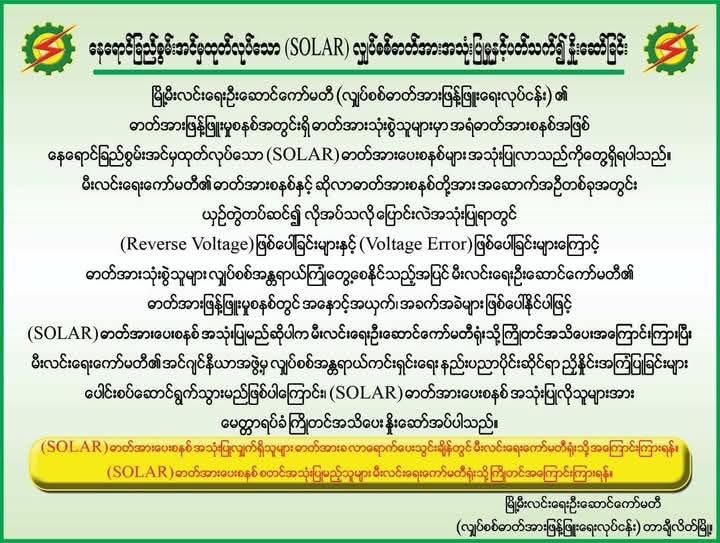 ရှမ်းပြည်နယ်၊ တာချီလိတ်မြို့တွင် ယနေ့ မေလ ၂၆ ရက်နေ့တွင် မြို့မီးလင်းရေးကော်မတီက ထုတ်ပြန်ကြော်ငြာချက်တစ်ခုအရ၊ နေအိမ်များတွင် တပ်ဆင်ထားသည့် ဆိုလာစနစ်များကြောင့် လျှပ်စစ်အန္တရာယ်ဖြစ်ပေါ်နိုင်မှုရှိသဖြင့်၊ သက်ဆိုင်ရာကော်မတီအား အသိပေးအကြောင်းကြားရန် ပြည်သူများကို တိုက်တွန်းထားသည်။ဆိုလာစနစ်များကို သတ်မှတ်ချက်နှင့်အညီ တပ်ဆင်ခြင်း၊ လုံခြုံရေးစနစ်များပါဝင်စေရန်၊ လျှပ်စစ်အန္တရာယ်ကင်းစေရန် တာဝန်ရှိသူများအား ဆက်သွယ်တင်ပြရန် မိန့်ကြားထားခြင်းဖြစ်သည်။
