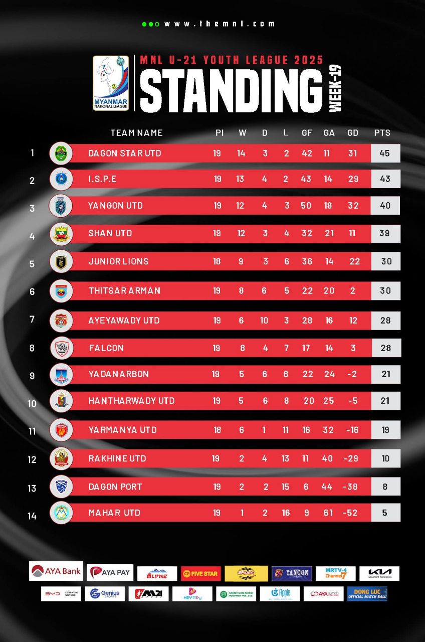 MNL (U-21) Youth League 2025 အမှတ်ပေးဘောလုံးပြိုင်ပွဲ (Week-19) ရလဒ်များနှင့် ရပ်တည်မှုဇယားမှာ အောက်ပါအတိုင်း ဖြစ်ပါသည်။